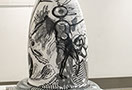 In this recent work I have been exploring different ways of drawing on ceramic forms. Instead of drawing with my own hand, I have been employing decal images of different line qualities from different time periods and different artists to compose and collage my drawings. In a way it is like drawing with someone else’s hands or like conducting a piece of music. In the same manner that musical artists are sampling sounds and music of other artists to reconstruct into their own compositions, I am sampling images to reconstruct into intense, layered, mythological narratives, which have a very different rhythm than flat drawings. Some of the themes that are emerging are Biblical, Mythological and Scientific in nature. I have been exploring the origins of our species, the moral dilemma of good and evil, the role of man in nature, and the interface of science, technology and mythology.2
