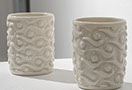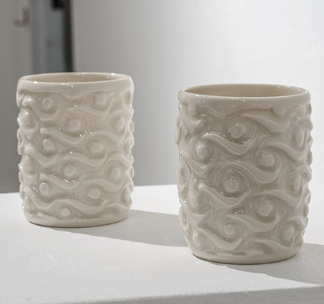 The tactile feel and visual look of surface textures are essential to my pieces. I create textures by deeply impressing patterns into thrown cylinders. Then, working from the inside only, I expand the cylinder to create the final form. This technique allows the pattern to evolve as the clay twists and expands. As the pattern adjusts to the shape and function of the vessel, it becomes reflective of Nature’s adaptation to form.