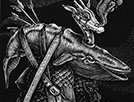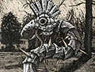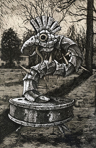 OThe Denizens etchings explore human folly. The characters are absurdly constructed of mechanical and organic elements. Just like many people, they are unaware of an awkward and ill-conceived nature. The series also references similar veins within popular culture. For example, Denizens V: The Bachelor was influenced by my reaction to Beyonce’s Single Ladies (Put a Ring on It) music video. These denizens belong to a collective, a neighborhood. As such, the background of each image indicates a suburban landscape. Similar to Goya’s Caprichos, these manifestations emerge while the rational mind sleeps. In the late evenings and early mornings, these creatures dance, fly and fight.