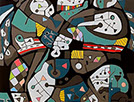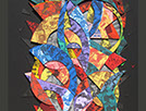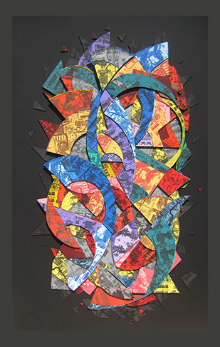 The arrangements of the pre-cut shapes in my collages are decided upon by their implied suggestions of space in their relationship to one another. When I am working extremely well there is a point when I begin to work completely intuitively, in a place where my compositional choices do not depend on conscious knowledge of composition and color. The decisions become automatic and the collage elements themselves dictate their positions. Surprising and unexpected choices are allowed and all visual arrangements seem possible.