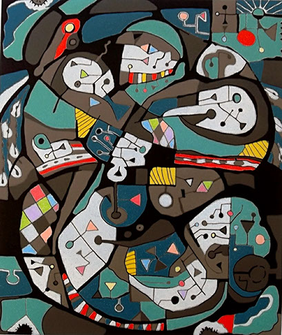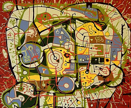 Most of the work I have produced the past 15 years is based upon my original studies and work as an anthropologist/archaeologist. In recent years my focus has been on creating abstract images which borrow from biology, geography and technology combined with the concepts used by anthropologists , especially the circle (female) and triangle (male) symbols used to construct social network diagrams.